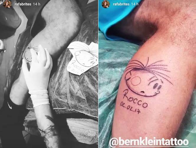 Andreoli escolheu desenhar na panturrilha o rosto do Cebolinha, personagem da “Turma da Mônica”, com a data de nascimento do menino: 2 de fevereiro de 2017. O detalhe fofo é que a letra tatuada é de Rafa Brites.