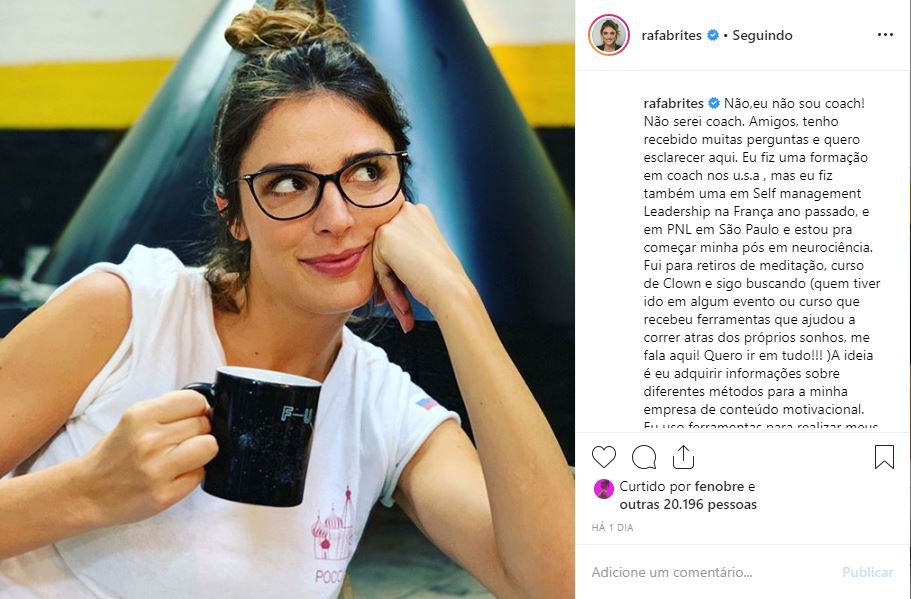 “Não, eu não sou coach! Não serei coach. Amigos, tenho recebido muitas perguntas e quero esclarecer aqui. Eu fiz uma formação em coach nos U.S.A , mas eu fiz também uma em Self management Leadership na França ano passado, e em PNL em São Paulo e estou pra começar minha pós em neurociência. Fui para retiros de meditação, curso de Clown e sigo buscando (quem tiver ido em algum evento ou curso que recebeu ferramentas que ajudou a correr atras dos próprios sonhos, me fala aqui! Quero ir em tudo!!! ) A ideia é eu adquirir informações sobre diferentes métodos para a minha empresa de conteúdo motivacional. Eu uso ferramentas para realizar meus sonhos há 20 anos, e quero compartilhar com vcs as minhas (que aprendi com meu pai), e a de todo mundo que esta ai fazendo coisas legais”, começou o texto.