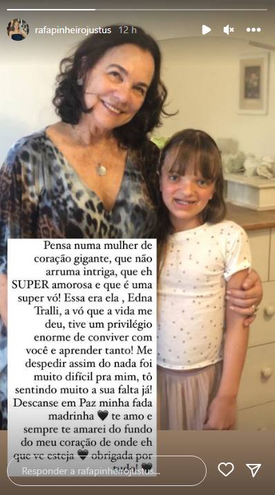 Através de sua conta oficial do Instagram Stories a menina postou uma foto ao lado de Edna e escreveu o seguinte: ”Pensa numa mulher de coração gigante, que não arruma intriga, que eh super amorosa e que é uma super vó! Essa era ela, Edna Tralli, a vó que a vida me deu, tive um privilégio enorme de conviver com você e aprender tanto! Me despedir assim do nada foi muito difícil pra mim, tô sentindo muito a sua falta já! Descanse em Paz minha fada madrinha. Te amo e sempre te amarei do fundo do meu coração de onde eh que esteja. Obrigada por tudo.”, comunicou.
