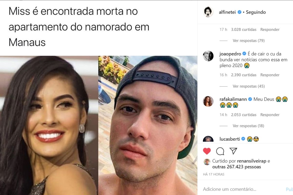 Através de seu perfil no Instagram, Rafa Kalimann reagiu a uma publicação do ‘Alfinetei’, que falava sobre a tragédia acontecida com a miss. A participante do ‘BBB 20‘, então, ficou chocada e chorou ao lamentar a triste morte: “Meu Deus”, disse ela, finalizando a sua mensagem com figurinhas de lágrimas. Veja abaixo: