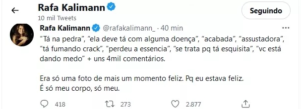 “’Tá na pedra’, ‘ela deve tá com alguma doença’, ‘acabada’, ‘assustadora’, ‘tá fumando crack’, ‘perdeu a essência’, ‘se trata porque tá esquisita’, ‘você está dando medo’ mais uns 4 mil comentários. Era só uma foto de mais um momento feliz. Porque eu estava feliz. É só meu corpo, só meu”, desabafou a apresentadora.