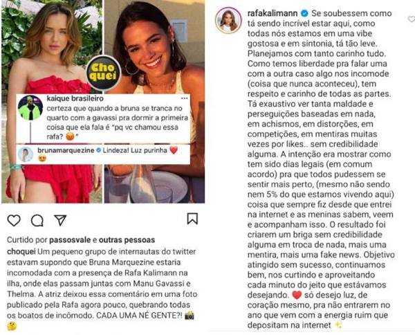Antes, Rafa Kalimann respondeu a um post em um perfil de fofoca no Instagram na quarta-feira (30) para negar os boatos que estão circulando na web. O post cogitava o desentendimento entre as duas famosas e que Bruna não aguentava mais a influencer filmando 24 horas por dia.