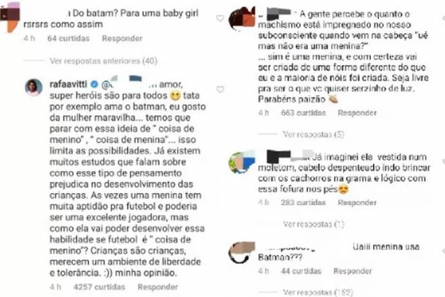 A compra, como era de se esperar, gerou a divisão de opinião nas redes sociais, e houve quem se incomodasse com a escolha do global. “Do Batman? Para uma garota? Como assim?”, questionou uma internauta. Rafa Vitti, então, se manifestou e disparou: “Amor, super heróis são para todos. Tata por exemplo ama o batman, eu gosto da mulher maravilha… temos que parar com essa ideia de “ coisa de menino” , “ coisa de menina”… isso limita as possibilidades”, disse.