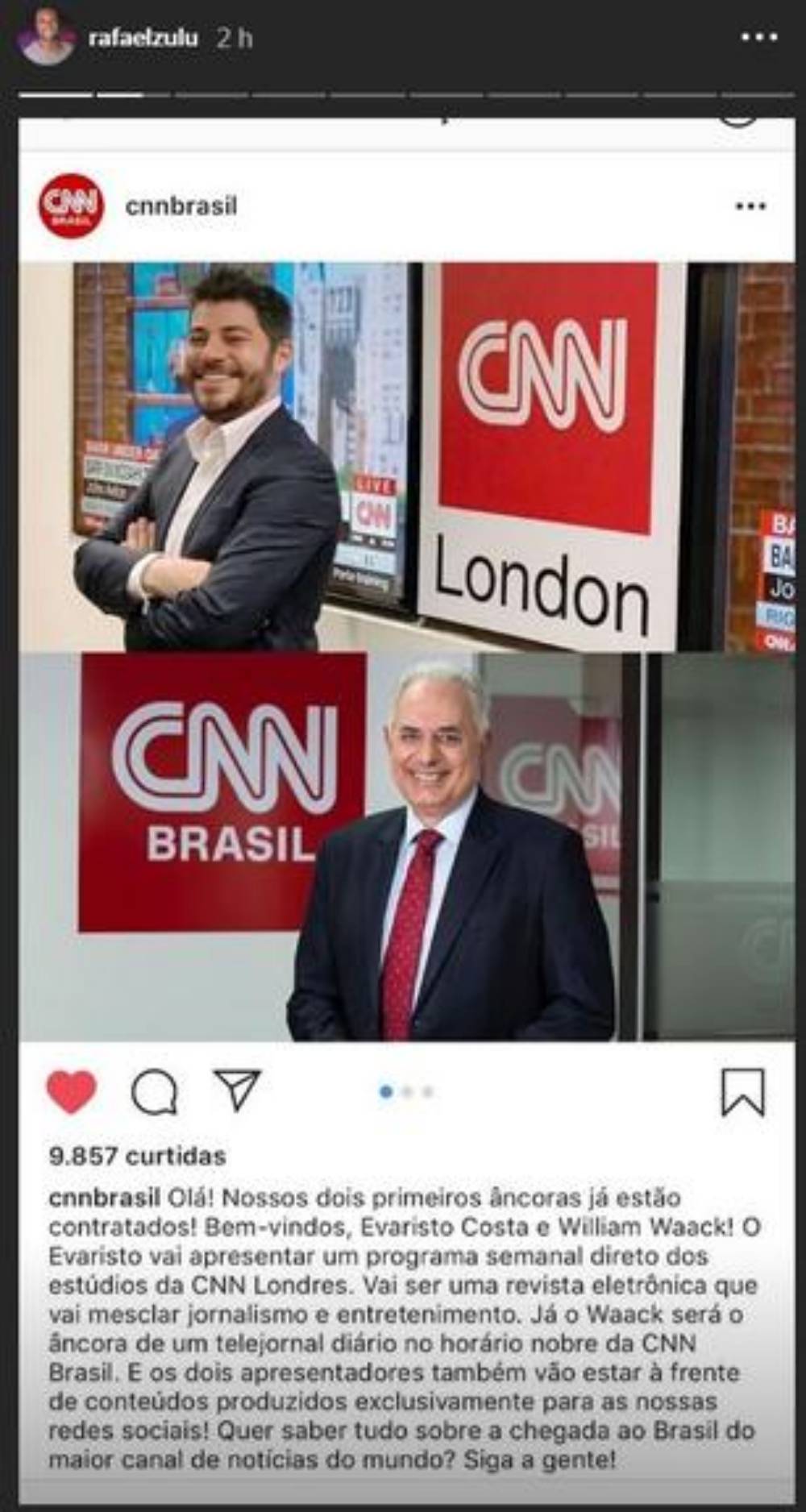 No Instagram, Zulu compartilhou o post do anuncio da contratação de Waack, ao lado de Evaristo Costa, quem ele disse admirar muito, e relembrou o motivo do ex-âncora do ‘Jornal da Globo’ ter deixado a emissora.