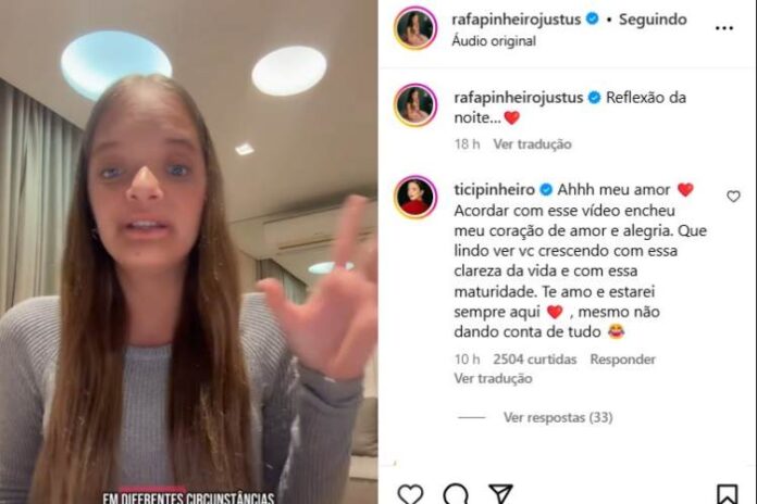 Roberto Justus e Ticiane Pinheiro rasgaram elogios a atitude da filha nos comentários: “Filha, que orgulho dessa sua clareza, sua mente privilegiada e sua sensibilidade! Nem parece que tem apenas 15 anos! Te amo demais!”, disse o empresário.