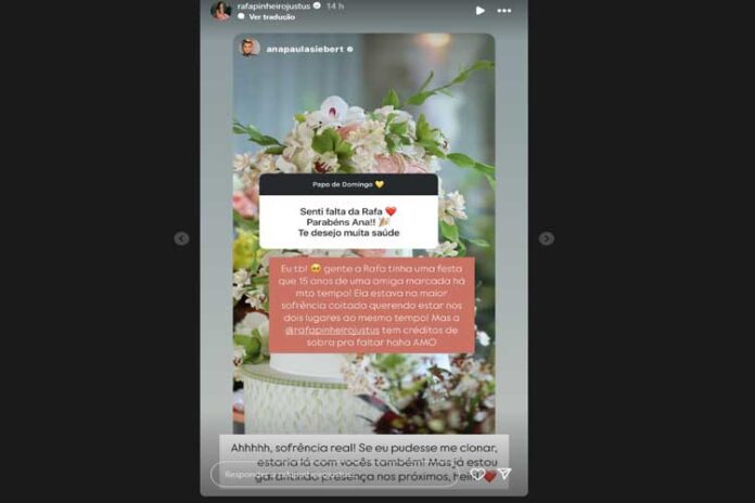 Em uma caixinha de perguntas, a esposa de Justus foi questionada sobre a ausência de Rafa, explicando que ela não pôde estar presente por causa de outra festa. “Gente, a Rafa tinha uma festa de 15 anos de uma amiga marcada há muito tempo! Ela estava na maior sofrência, coitada, querendo estar nos dois lugares ao mesmo tempo! Mas a Rafe tem créditos de sobra pra faltar haha amo”, explicou.