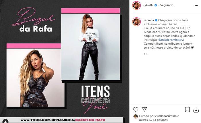 Acostumada a compartilhar seus momentos de lazer e os modelitos novos de sua coleção em nas redes sociais, Rafaella Santos usou seu perfil no Instagram nesta sexta-feira (19) para divulgar seu bazar beneficente.