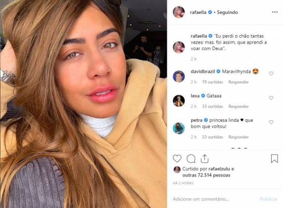 O click já conta até o momento com mais de 74 mil curtidas e ganhou vários elogios dos seus quase 5 mil seguidores. “Gata”, “Princesa linda”, “Ai meu coração”, “Te amo do tamanho da sua beleza”, “Linda”, foram alguns dos elogios que Rafaella recebeu.