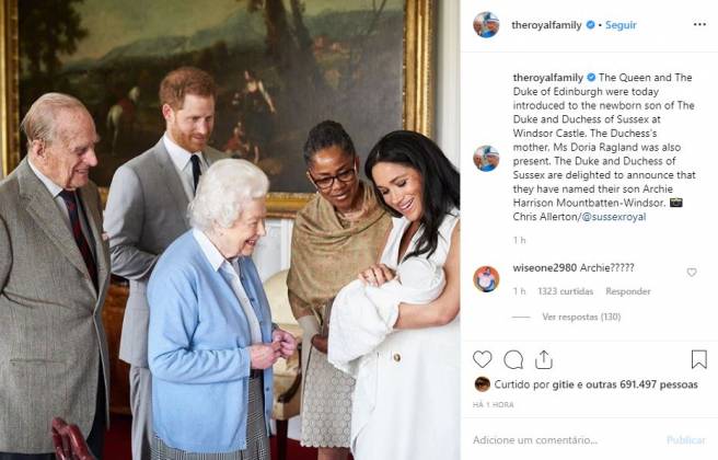 “Rainha e o duque de Edimburgo foram apresentados hoje ao filho recém-nascido do Duque e da Duquesa de Sussex no Castelo de Windsor. A mãe da duquesa, Sra. Doria Ragland, também estava presente. O duque e a duquesa de Sussex têm o prazer de anunciar que nomearam seu filho Archie Harrison Mountbatten-Windsor”, diz a publicação.