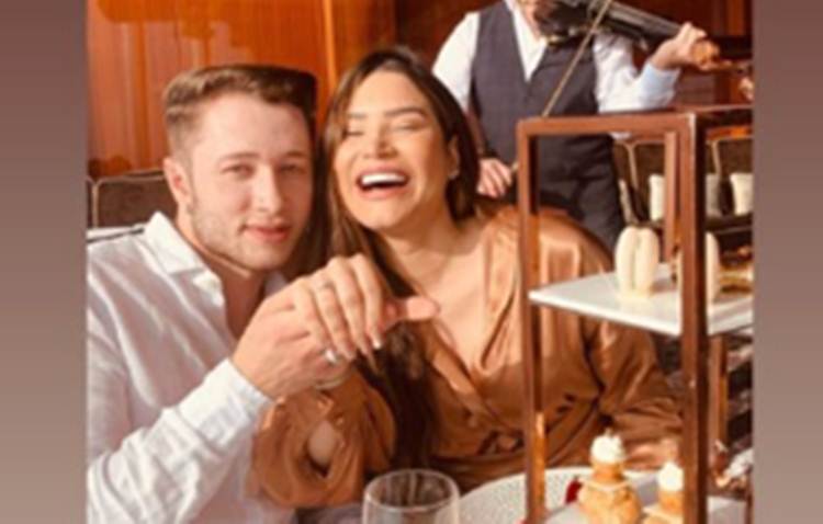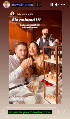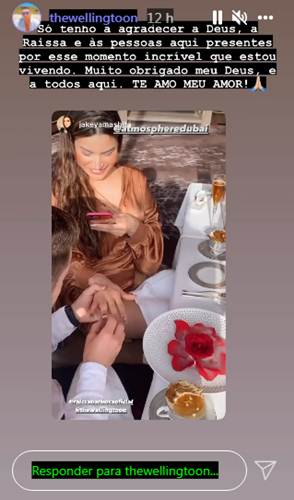 Quem compartilhou o momento foi o noivo nos stories de seu perfil no Instagram. “Só tenho a agradecer a Deus, à Raissa e às pessoas aqui presentes por esse momento incrível que estou vivendo”, escreveu.
