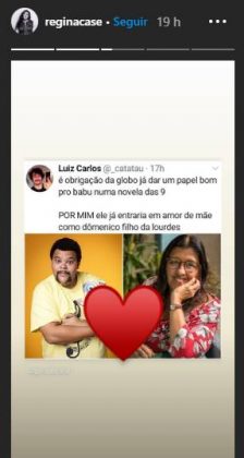 Ao saber da ideia, a atriz reagiu e demonstrou concordar com a ideia. No Instagram, ela publicou um desses comentários feitos por internautas e colocou um emoji de coração, mostrando que por ela tudo bem ser a mãe da ficção de Babu.