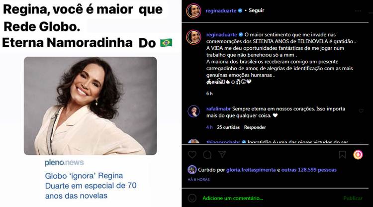 Nesta sexta-feira (23), Regina Duarte quebrou o silêncio e se manifestou sobre sua ausência no especial. Em seu perfil oficial no Instagram, a atriz publicou uma imagem em que aparece sorrindo, abaixo da frase: “Regina, você é maior que a Rede Globo”.