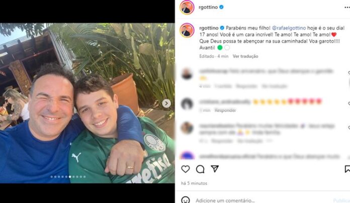 Diante da data mais do que especial, Reinaldo Gottino não deixou de celebrar o momento com uma bela homenagem, compartilhando alguns cliques com o jovem rapaz, expressando seu amor por ele. “Parabéns meu filho! @rafaelgottino hoje é o seu dia! 17 anos! Você é um cara incrível! Te amo! Te amo! E te amo! Que Deus possa te abençoar na sua caminhada! Voa garoto!!!! Avanti!“, escreveu o jornalista da Record.