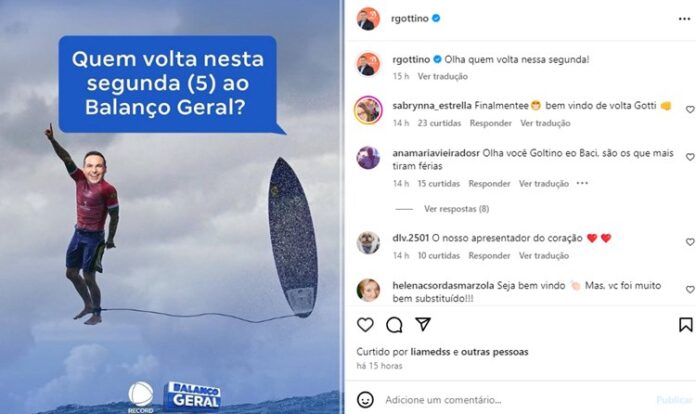 Nos comentários, os fãs de Gottino clamaram: “Chega de férias né? Vamos ficar quietinho ai no programa, sem você não tem graça“, escreveu uma telespectadora. “Olha você Gottino e o Bacci, são os que mais tiram férias na TV, meu Jesus“, comentou mais uma. “Por favor, chega de férias, amamos te assistir, foi difícil sem você“, reagiu mais uma seguidora.