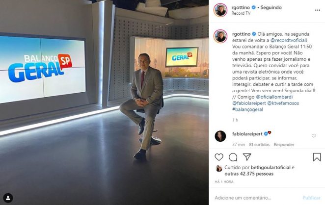 Em seguida Gottina fez um convite aos seus seguidores. “Quero convidar você para uma revista eletrônica onde você poderá participar, se informar, interagir, debater e curtir a tarde com a gente! Vem vem vem! Segunda dia 8 // Comigo @oficiallombardi @fabiolareipert @ktvefamosos #balançogeral”, acrescentou o apresentador.