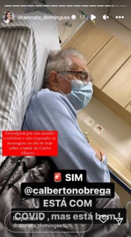 Dessa forma, por meio dos stories no Instagram, Renata Domingues confirmou, mais uma vez, a internação do marido, Carlos Alberto de Nóbrega, e afirmou que não estava conseguindo atender chamadas e nem responder mensagens no momento, pois estava ao lado do companheiro de 87 anos. No entanto, a médica, ainda revelou aos fãs e amigos, que o apresentador estava bem e publicou uma foto, aonde ele surge de mascara e deitado no leito hospitalar.