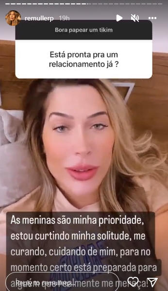 “Nem estou pensando nisso agora. Primeiro que o divórcio nem saiu. A gente ainda está vendo essas questões. Segundo porque é tudo muito recente. O peso para a mulher é diferente, tenho as minhas filhas. As meninas são minha prioridade. Estou curtindo minha solitude, me curando, cuidando de mim, para no momento certo estar preparada para alguém que realmente me mereça”, explicou ela, que tem duas filhas com Pecoraro.