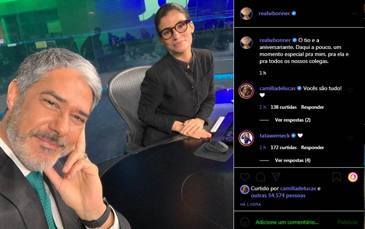 Os seguidores do jornalista parabenizaram Renata, mas queriam também que Bonner acabasse com o mistério do que revelaria durante a edição do JN. “Parabéns, Renata! ❤ Conta logo essa surpresa, tio!”, disse uma. “Vai ter parabéns ao vivo”, disse mais uma. “Deve ser uma honra sentar ao lado dessa mulher. ❤”, escreveu outro.