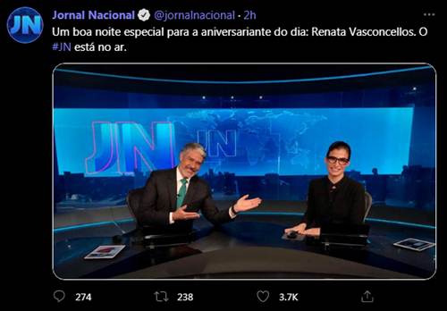 No twitter oficial do JN, Bonner abriu o telejornal parabenizando a colega de bancada.”Uma boa noite especial a aniversariante do dia: Renata Vasconcellos”, escreveu.