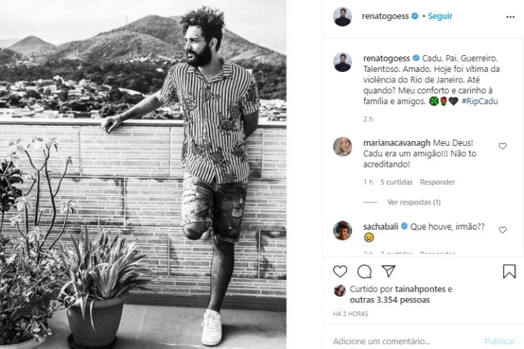 Através de seu perfil oficial nas redes sociais, ele compartilhou uma foto do famoso e, na legenda da publicação, lamentou: “Cadu. Pai. Guerreiro. Talentoso. Amado. Hoje foi vítima da violência do Rio de Janeiro. Até quando?”. Veja na imagem abaixo separada pela equipe de arte do site: