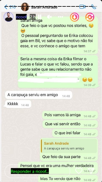 Ainda nos stories do Instagram, Rico Rico expôs um suposto print de sua conversa com Sarah, na qual ele alerta que foi “feio” o que ela publicou e que Sarah “conhece o amigo que tem”. A ex-BBB, porém, responde apenas que “a carapuça serviu” e ri. “Pensei que você era uma mulher verdadeira, mas tô vendo que não”, rebateu Rico.