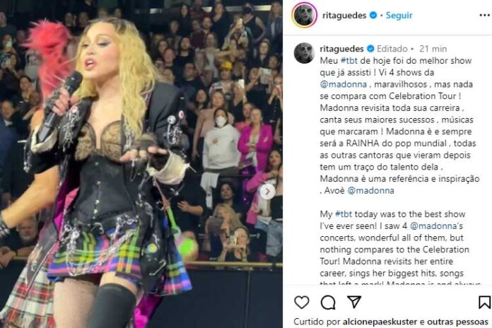 A atriz e produtora brasileira Rita Guedes usou seu perfil no Instagram para falar sobre a expectativa para o show de Madonna em Copacabana no próximo sábado (04). Após ter tido a oportunidade de ter participado de outras apresentações da artista, Rita entregou um spoiler dizendo que nada se compara à sua nova turnê em grandiosidade.