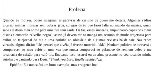 “Nenhum político se atreverá a comparecer ao meu velório, uma vez que nunca compareci ao palanque de nenhum deles e me levantaria do caixão para vaiá-los. Enquanto isso, estarei eu de alma presente no céu tocando minha autoharp e cantando para Deus: ‘Thank you Lord, finally sedated”. Epitáfio: Ela nunca foi um bom exemplo, mas era gente boa”, encerrou.
