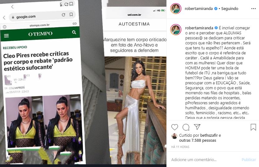 No Instagram, Roberta Miranda postou uma de duas manchetes onde mostram que Cleo e Marquezine foram criticadas por causa dos seus corpos, e a sertaneja aproveitou para detonar aqueles que acham que podem falar sobre o que não lhes pertencem.