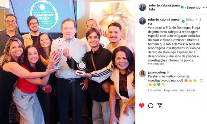 Através do Instagram, Cabrini comemorou a vitória ao lado de sua equipe: “Vencemos o Prêmio Domingos Fraga de jornalismo categoria reportagem especial com a investigação exclusiva do caso Vinicius Gritzback” Título:”O homem que sabia demais”.A série de reportagens investigativas foi exibida dentro do Domingo Espetacular e desencadeou uma série de prisões e investigações internas na polícia”, diz a legenda da imagem compartilhada.