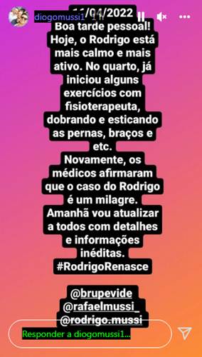 Diogo que o irmão deu um novo passo rumo à recuperação plena e iniciou as primeiras sessões de fisioterapia. “Hoje o Rodrigo está mais calmo e mais ativo. No quarto, já iniciou alguns exercícios com o fisioterapeuta, dobrando e esticando as penas, braços e etc. Novamente, os médicos afirmaram que o caso do Rodrigo é um milagre”, disse a mensagem publicada pelo irmão, que ressalta que mesmo assim o processo de extubação não foi finalizado.