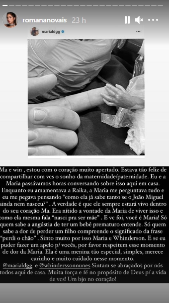 Em seguida, Romana, que deu à luz Raika também de forma prematura, fez questão de prestar apoio ao casal. “Era nítido a vontade da Maria de viver isso e como ela mesma fala ‘nasci pra ser mãe’. E você foi, você é Maria! Só quem sabe a angústia de ter um bebê prematuro entende. Só quem sabe a dor de perder um filho compreende o significado da frase ‘perdi o chão’. Sinto muito por isso Maria e Whindersson”.