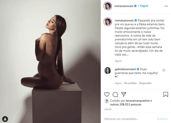 Na legenda, ela explicou. Passando pra contar pra vcs que eu e a Raika estamos bem. Desde segunda estamos juntinhas. Foi muito emocionante o nosso reencontro. A rotina de mãe de prematurinha em uti tem sido bem cansativa além de ser tudo muito novo pra gente… então essa semana foi de muito aprendizado. Um dia de cada vez….”, escreveu.