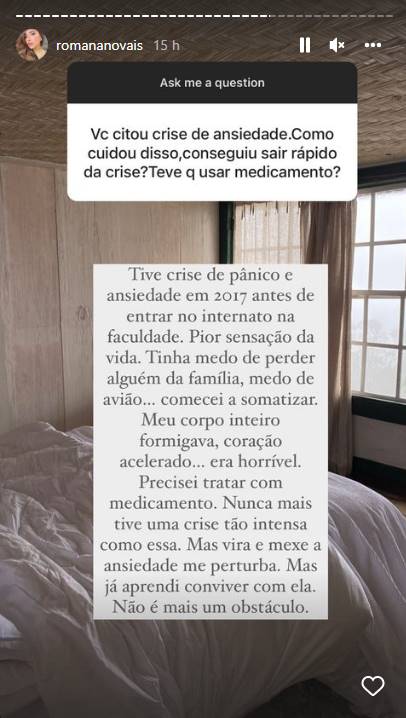 Romana resolveu abrir uma caixa de perguntas nos seus stories. Um seguidora, perguntou então: ”Você citou crise de ansiedade. Como Cuidou disso, conseguiu sair rápido da crise? Teve que usar medicamento?”, indagou a internauta para Novais. Logo, ela respondeu o seguinte: “Tive crises de pânico e ansiedade em 2017, antes de entrar no internato da faculdade. É a pior sensação da vida. Tinha medo de perder alguém da família, de avião? comecei a somatizar”, começou a falar a influencer.