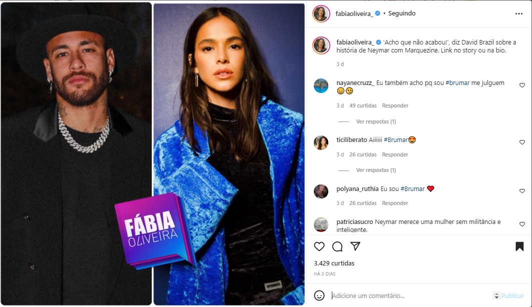 “Eu também acho pq sou #brumar me julguem”, comentou uma fã ao que deparar com essas falas. Outros, ainda, dispararam: “Isso todo brasileiro sabe”, “Ela sonha ainda. Sem a globo e sem Neymar os holofotes estão cada vez mais distantes” e “Aiaiiii Deus sabe todas as coisas, está nas mãos dele, que eles se amam já sabemos”.