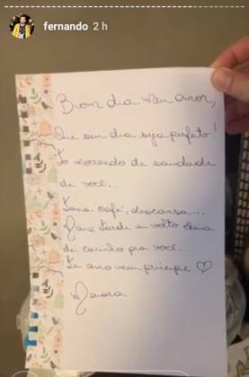 Apaixonada, além da mesa bonita a cantora sertaneja ainda escreveu uma cartinha ao amado: “Bom dia meu amor! Que seu dia seja perfeito! Tô morrendo de saudades de você… Toma café, descansa. Mais tarde eu volto cheia de carinho para você. Te amo meu príncipe”.