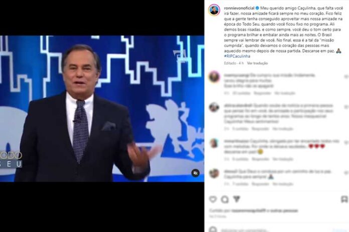 Falando sobre o trabalho ao lado de Caçulinha, Ronnie destacou que ele conseguia dar o tom certo à atração. “Ali demos boas risadas, e, como sempre, você deu o tom certo para o programa brilhar e embalar ainda mais as noites. O Brasil sempre vai lembrar de você. No final, essa é a tal da ‘missão cumprida’, quando deixamos o coração das pessoas mais aquecido mesmo depois de nossa partida. Descanse em paz”, completou.
