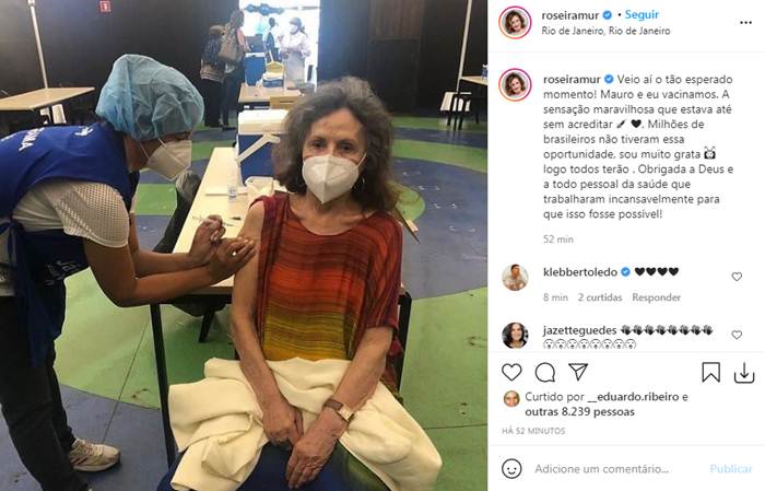 Os amigos da atriz também comemoraram a notícia. “Vacinada!!!! Q demais, Rosinha❤❤❤”, escreveu uma. “Que emoção!!! Maravilhosa”, disse outra. “Que bom! QUE BOM!!!! Fico muito feliz! ❤ @roseiramur receba meu abraço virtual, mas carregado de carinho e admiração”, escreveu mais um.