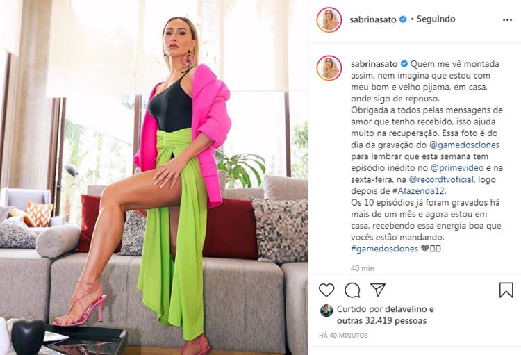 Ela ainda explicou quando foi clicada na imagem compartilhada. “Essa foto é do dia da gravação do @gamedosclones para lembrar que esta semana tem episódio inédito no @primevideo e na sexta-feira, na @recordtvoficial, logo depois de #Afazenda12. Os 10 episódios já foram gravados há mais de um mês e agora estou em casa, recebendo essa energia boa que vocês estão mandando. #gamedosclones”, finalizou.