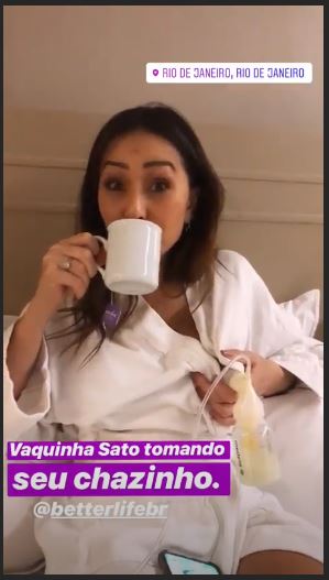 Mãe, apresentadora, modelo e empresária, Sabrina Sato se desdobra em várias para conseguir dar conta de seus compromissos, prova disso, foi a forma como ela encontrou de amamentar Zoe enquanto trabalha. “Vaquinha Sato tomando seu chazinho”, escreveu na legenda.