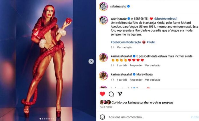 A apresentadora ainda surgiu com um outro look arrasador durante a noite: “A SERPENTE! Um releitura da foto de Nastassja Kinski, pelo ícone Richard Avedon, para Vogue US em 1981, mesmo ano em que nasci. Essa foto representa a liberdade e ousadia que a Vogue e a moda sempre me instigaram“, escreveu a japa em sua rede social.
