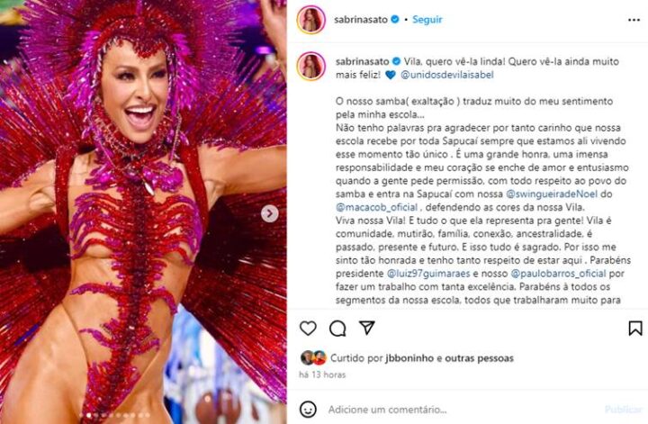 Ainda pelas redes sociais, Sato compartilhou uma linda homenagem a escola Vila Isabel: “O nosso samba( exaltação ) traduz muito do meu sentimento pela minha escola… Não tenho palavras pra agradecer por tanto carinho que nossa escola recebe por toda Sapucaí sempre que estamos ali vivendo esse momento tão único“, disse ela.