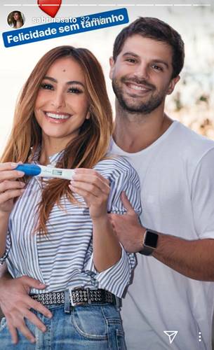 O casal posou com o teste de gravidez: “Felicidade sem Tamanho“, mostra a legenda da imagem, onde aparecem sorridentes.
