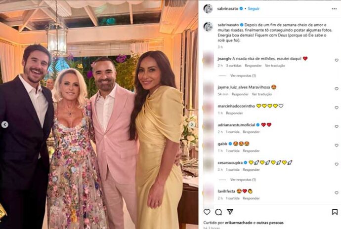 Sabrina Sato e Nicolas Prattes marcaram presença no casamento de Ana Maria Braga e Fábio Arruda, realizado na última sexta-feira (04). Através de seu perfil oficial no Instagram, a apresentadora surgiu ao lado dos noivos na mansão da comandante do “Mais Você”.