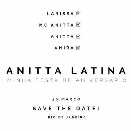 Mas de acordo com a coluna de Leo Dias, o tema será a cultura latina. A atração musical escolhida pela Poderosa também foi definida: é o Tchakabum. Os convidados já começaram a receber o pré-convite da festa ‘Save the Date’ que ilustra todas as fases vividas por Anitta até hoje: Larissa, MC Anitta, Anitta e Anira, como os estrangeiros a chamam Brasil afora.