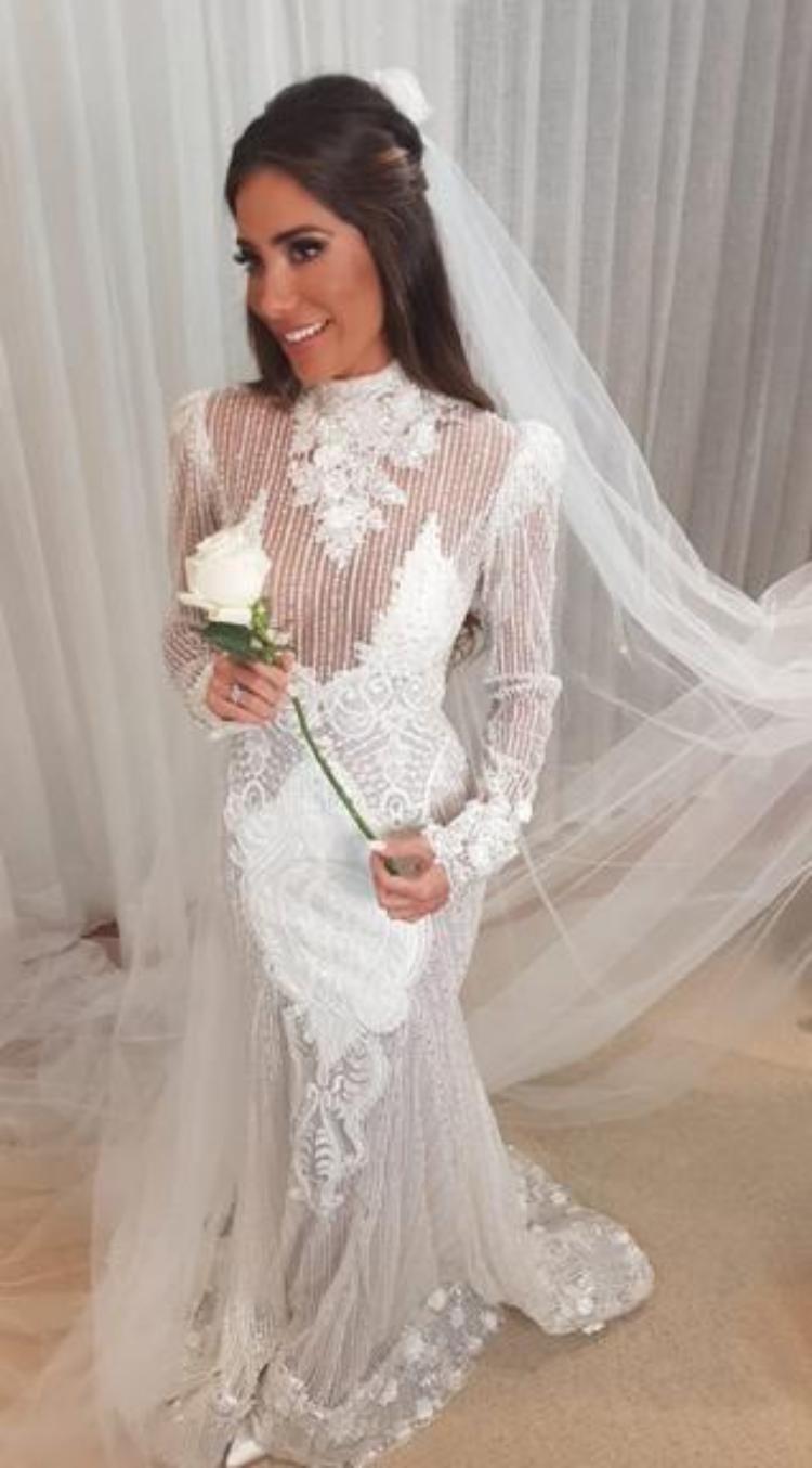 Para o momento da cerimônia, Samuel fez um vestido com inspiração Vitoriana, e um toque moderno, com estilo Sereia, com tule e bordas em mini cristais, pérolas e paetês. Para o look, foram três tipos de renda, entre elas estava a marescot. E para chegar ao resultado desejado, a noiva fez três provas.