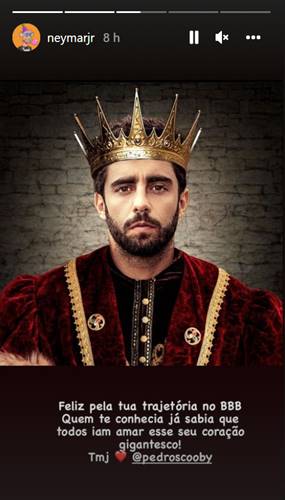 O atacante foi ao Instagram mostrar sua solidariedade para com Scooby que foi eliminado no último paredão. Na rede social, Neymar escreveu: “Feliz por sua trajetória no ‘BBB’. Quem te conhece já sabia que todos iam amar esse seu coração gigantesco. Estamos juntos”, disse.