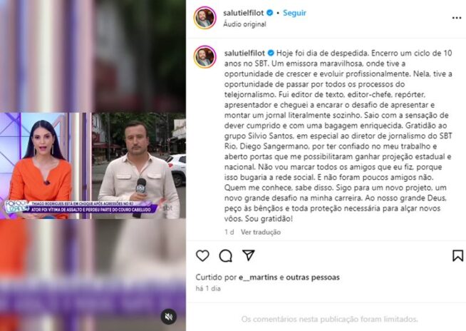 Nos comentários de sua postagem no Instagram, o perfil do SBT Rio escreveu: “Vamos sentir saudades, Salu!! Muito sucesso pra você nesse novo desafio“, desejaram. Como citado no inicio deste texto, Salutiel agora estará no ar pela Globo Rio.
