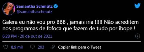 Nesta segunda-feira (25), o nome de Samantha Schmutz foi cogitado como uma possível integrante do ‘BBB22’. Porém, ela rapidamente fez questão de desmentir os rumores.