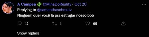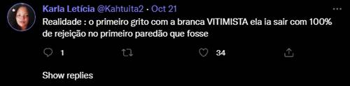 Depois do comunicado um tanto atrevido, a humorista recebeu uma enxurrada de críticas de internautas. “Ninguém quer você lá pra estragar nosso BBB”, falou uma. “Realidade: o primiero grito com a branca VITIMISTA ela ia sair com 100% de rejeição no primeiro paredão que fosse”, sentenciou outra.