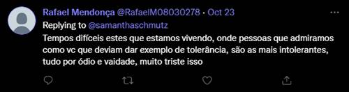 Outro internauta criticou a intolerância da artista. “Tempos difíceis estes que estamos vivendo, onde pessoas que admiramos como você que deviam dar exemplo de tolerância, são as mais intolerantes, tudo por ódio e vaidade, muito triste isso”, criticou.